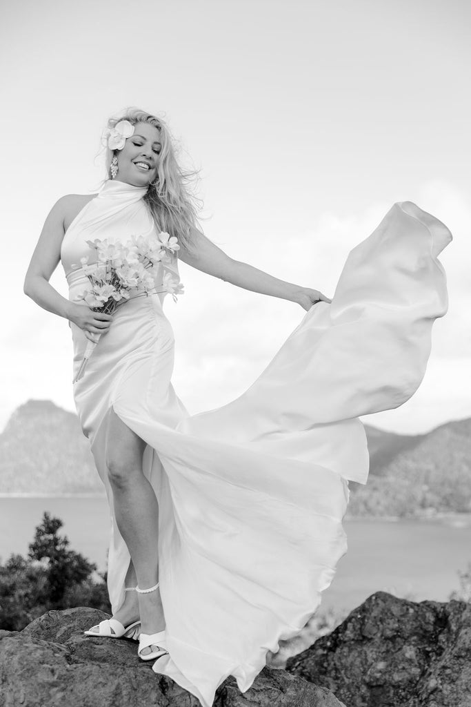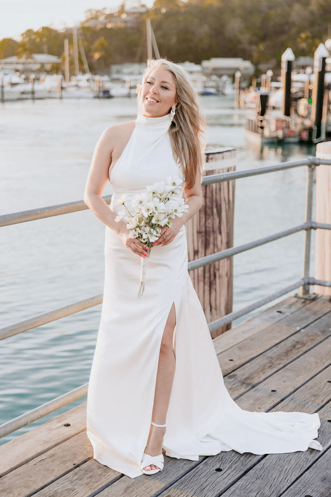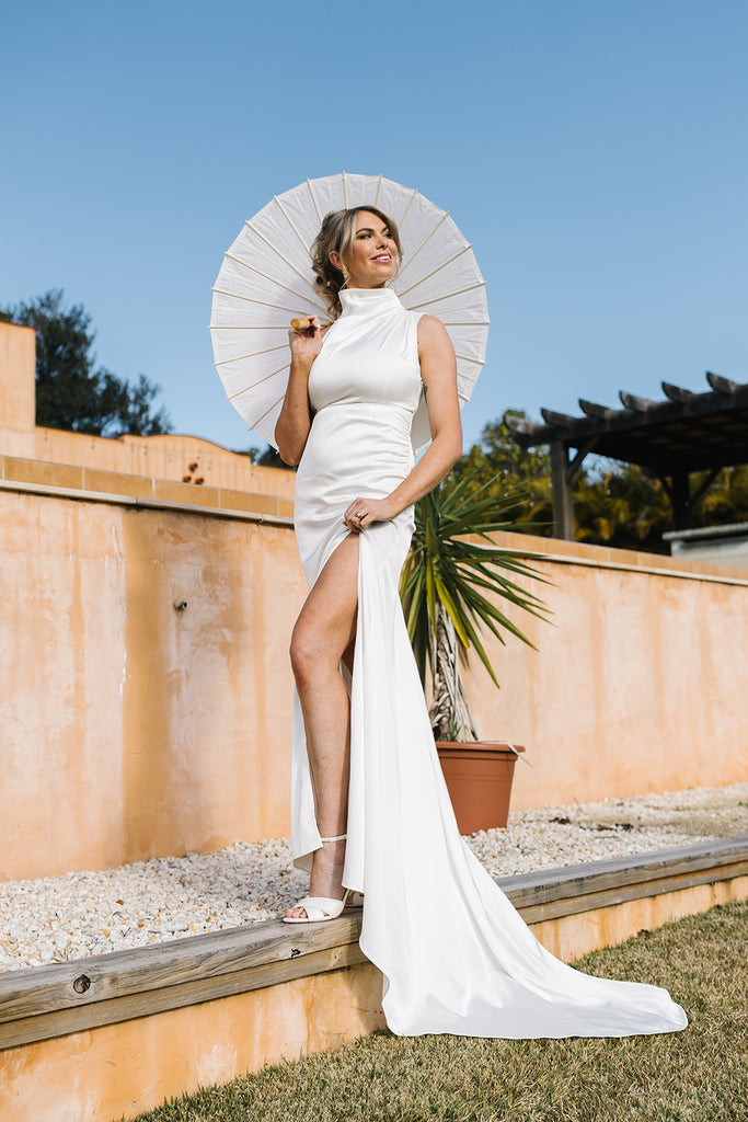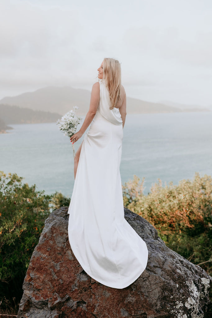 A subtle leg split for ease of movement, making it ideal for beach weddings, elopements, or garden ceremonies. Simple, elegant, and effortlessly chic.