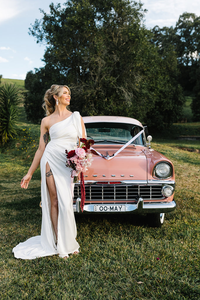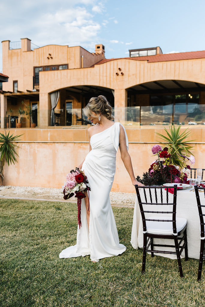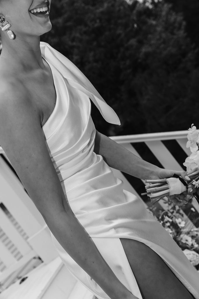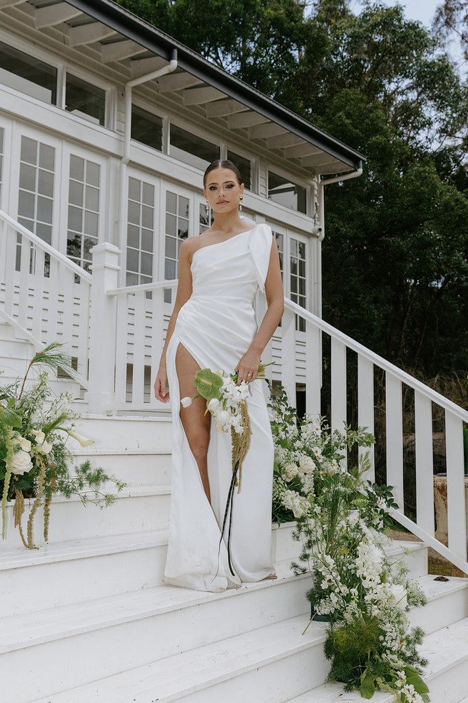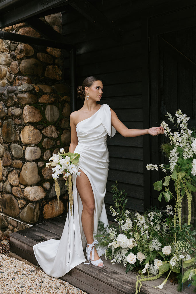 A soft tie shoulder for a romantic touch, a thigh-high split to float on camera with just the right amount of drama.