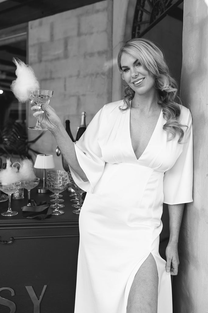 A modern bohemian design with a plunging V-neckline, kimono sleeves, and a leg split, blending 70s-inspired vintage style with contemporary minimalism.