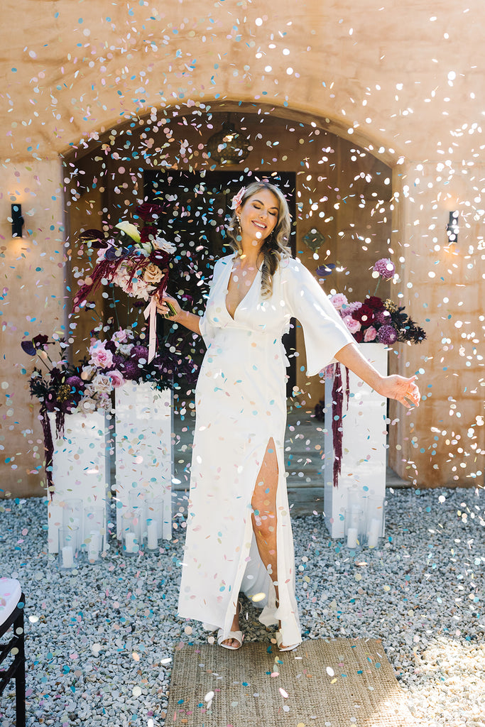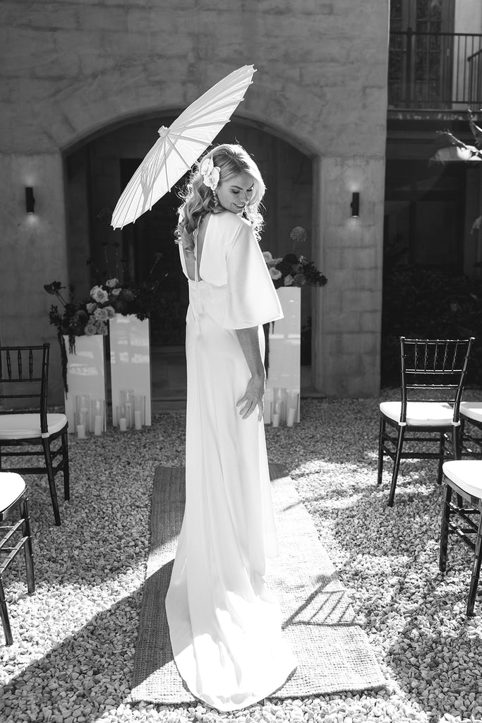 The kimono sleeves and low back add a touch of boho glam. Perfect for brides seeking a blend of modern minimalist and retro flair.